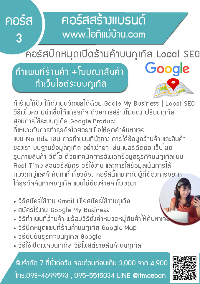 ถ้าอยากโฆษณสินค้าของตัวเองแบบง่ายๆ ฉลาดๆ ได้ผลในระยะยาว ช่วยลดต้นทุน ที่สำคัญไม่มีค่าใช้จ่ายสักบาท ครูเจ ขอแนะนะคอร์ส Google My Business สอนโดยไอทีแม่บ้าน ค่ะ